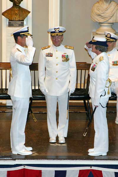 Rear Admiral Vivien S. Crea turns over the reign of command of the First Coast Guard District to Rear Admiral David P. Pekoske in ceremonies held at the Faneuil Hall in Boston. Back to the edition of: Aug/Sep 2004