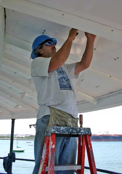 Alex Griatzky of Atlantic Mechanical secures the bolts under one of the new panels on the lighthouse canopy. Back to the edition of: Aug/Sep 2004